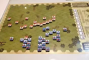 드리츠님과 난 서로서로 작전없이 일단 룰을 익히는게 주 목적임으로 난투전을 벌였다. 이 게임은 전투에서 패배하면 뭉쳐져 있던 유닛들이 다 분리되기 때문에, 다음 턴에 다시 모집하는데 명령을 다 소모해야한다. 나름 실전같은? 그런 룰이다.