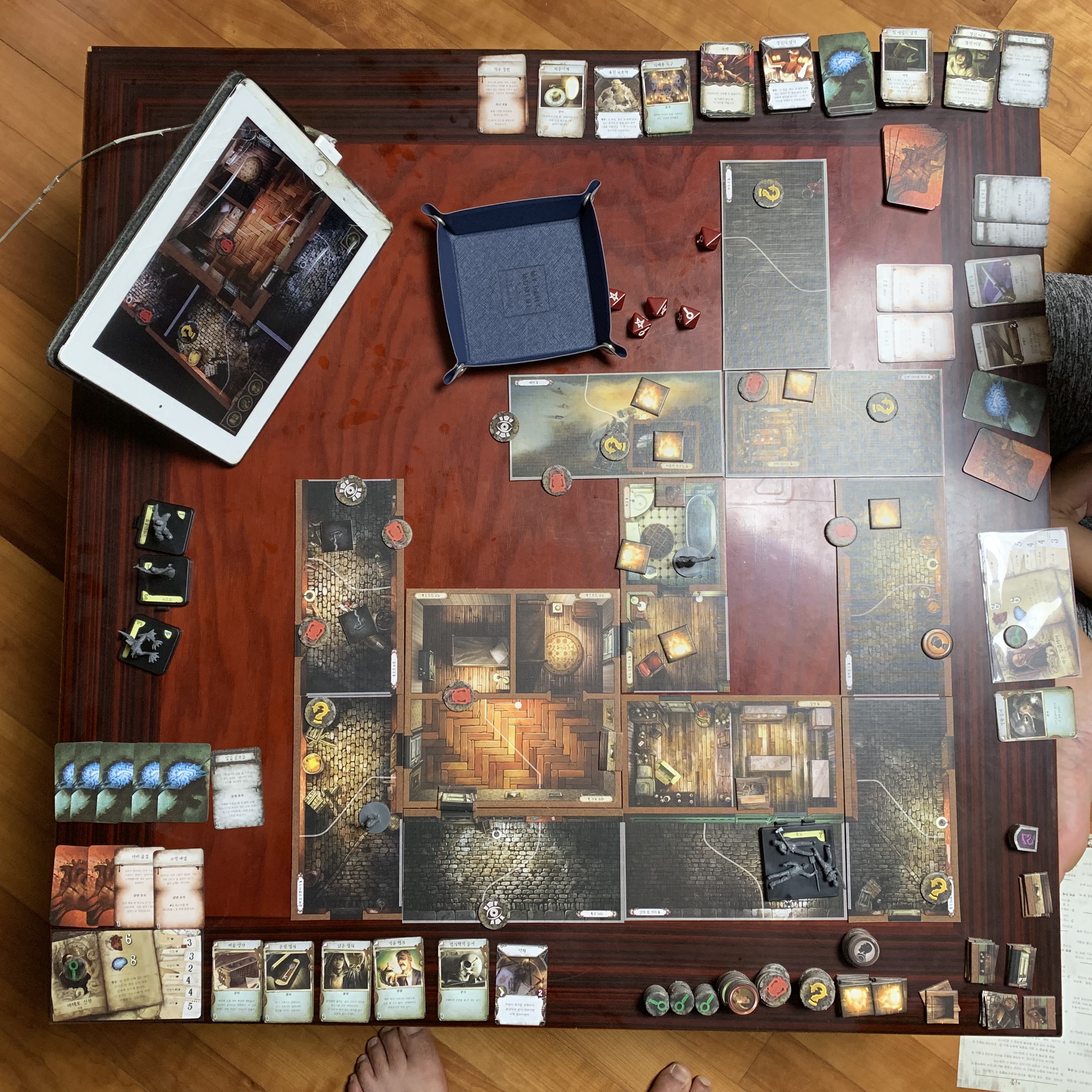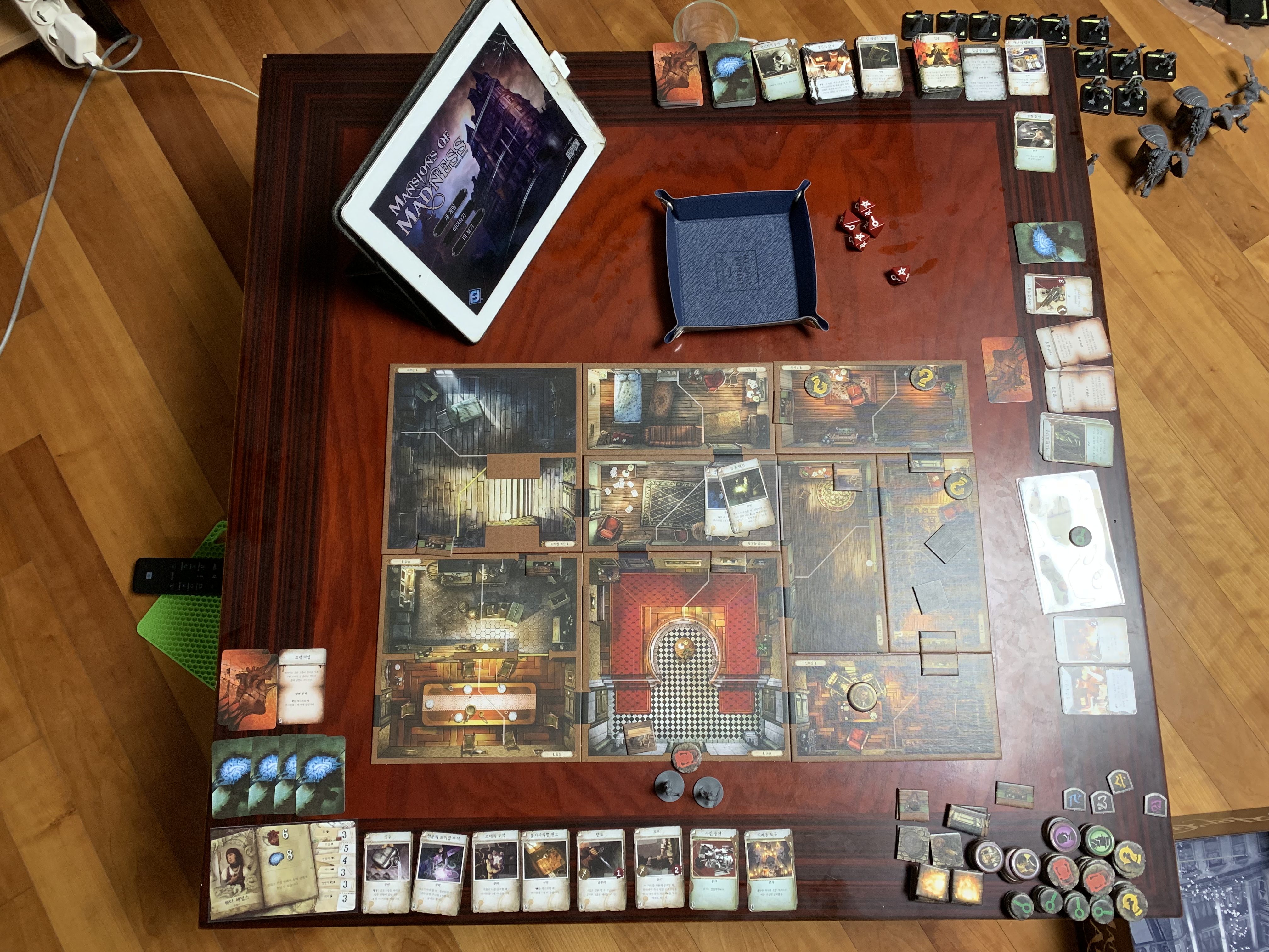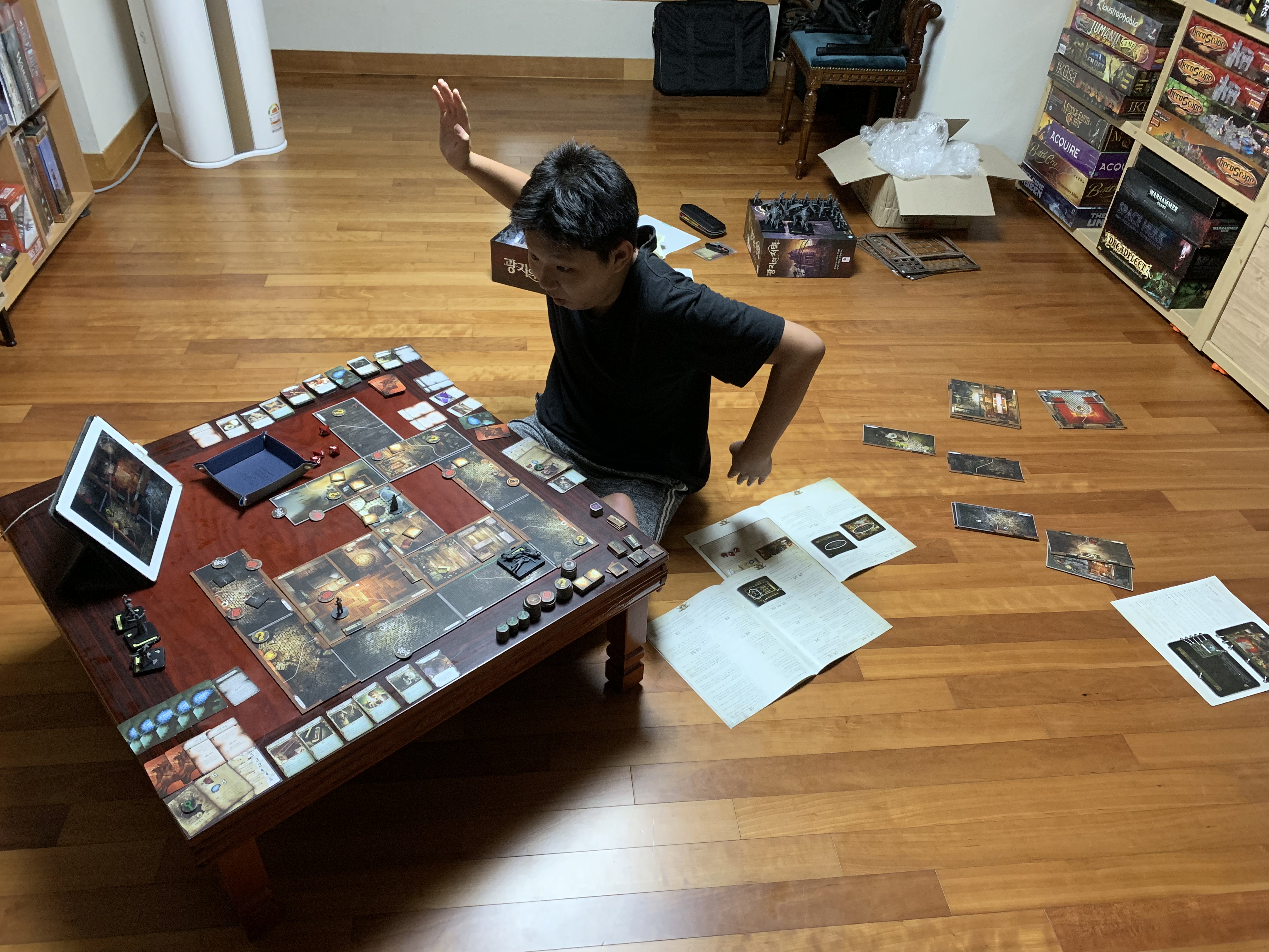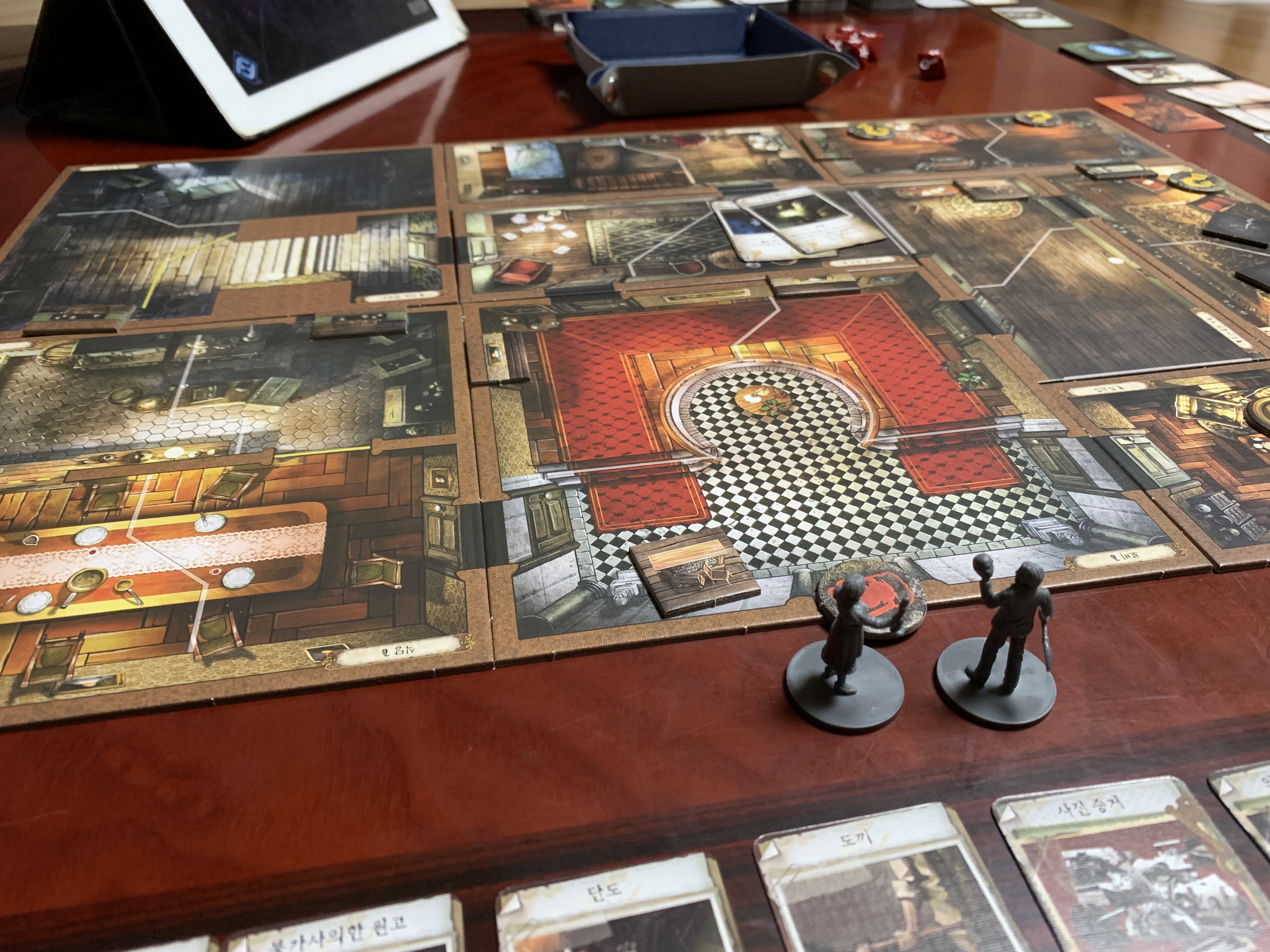 일요일에 다시 도전을 했다. 어제 하던 시나리오로 다시 해보자 했는데... 새로운걸로 좀 쉬운걸 골라서 하자는 아들의 제안으로 그렇게 하기로 했다. 광기의 저택에서 광신도의 존재를 알아 내고 그 증거를 찾아 탈출하는 내용이다. 게임의 제목처럼 광기의 저택그 자체였다. 역시나 게임은 잼있었다. 시나리오를 진행하면서 공개되는 맵을 찾아 배치하고, 조사자들의 행동을 마치면, 신화단계로 이어지고, 그러면서 필요한 단서를 찾아 퍼즐도 풀어가며 헤쳐나가는 진행이 아주 잼있었다. npc도 등장하는데 계속 대화를 걸면 무기를 주기도 한다. 온라인 게임을 하는 기분이 들기도 한다. 거의 10년이 다되어 가는 아이패드에서 울려퍼지는 음산한 배경음악과 게임을 진행하면서 굴리는 주사위 소리~~~. 이 모든게 훌륭하게 잘 어우러지는 게임이다.
