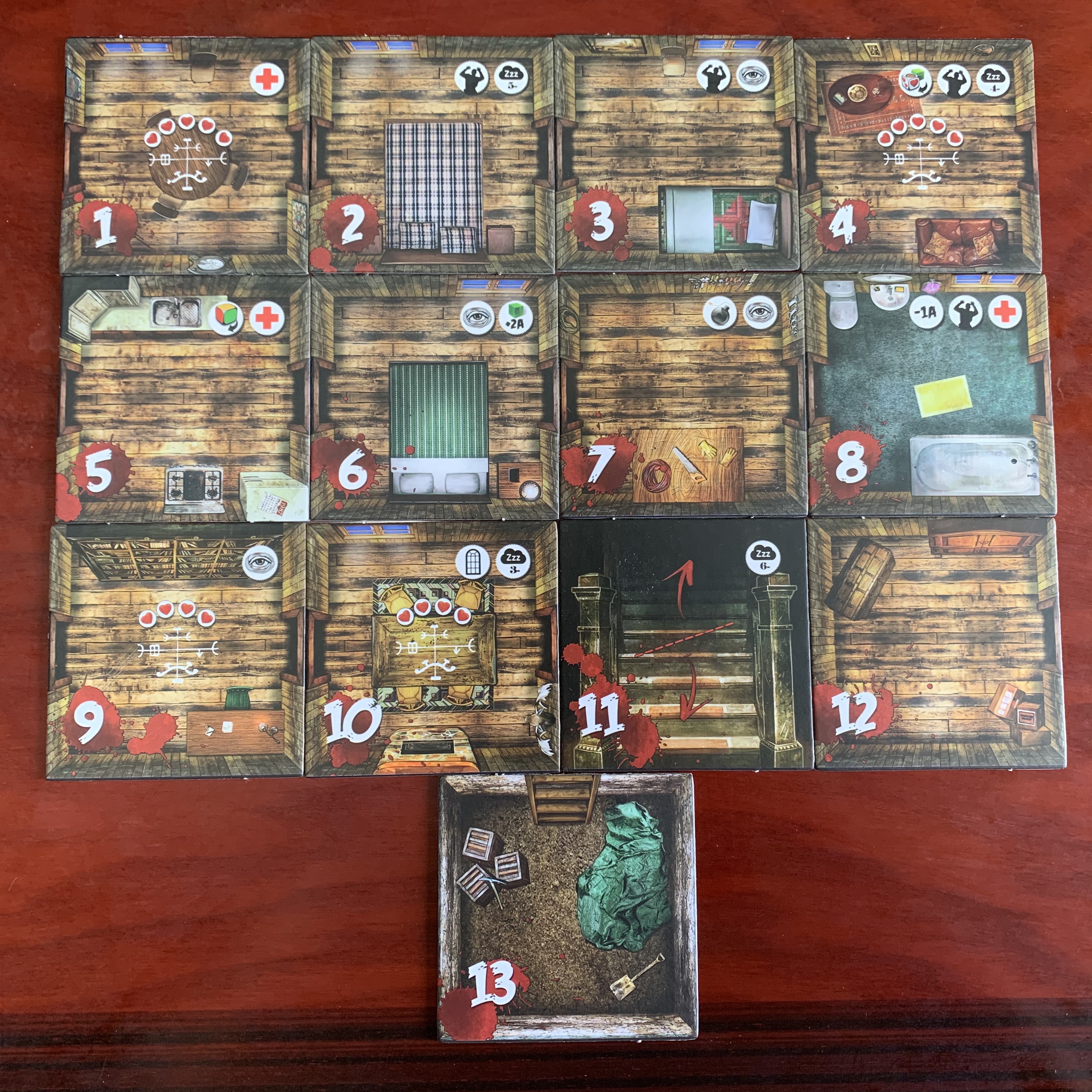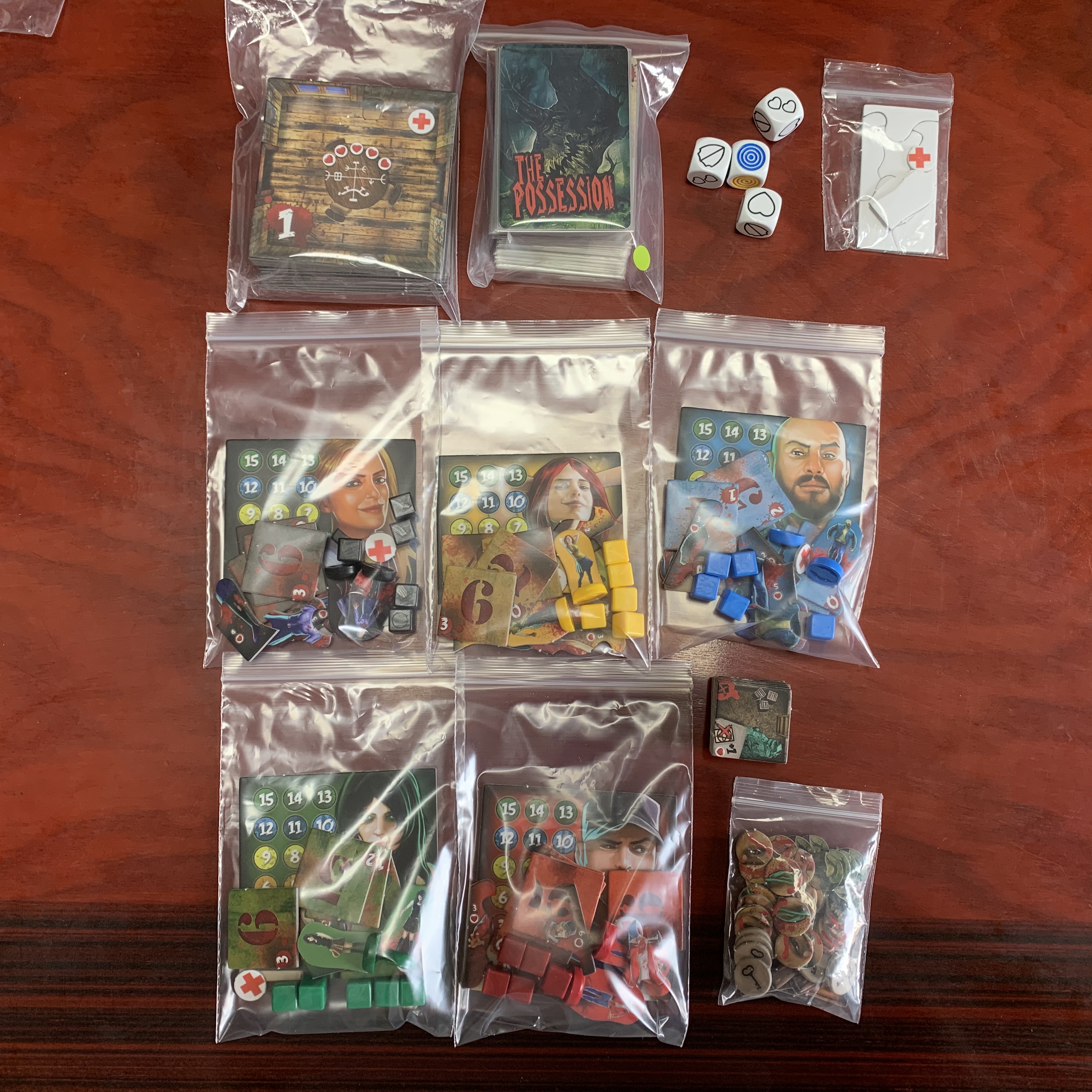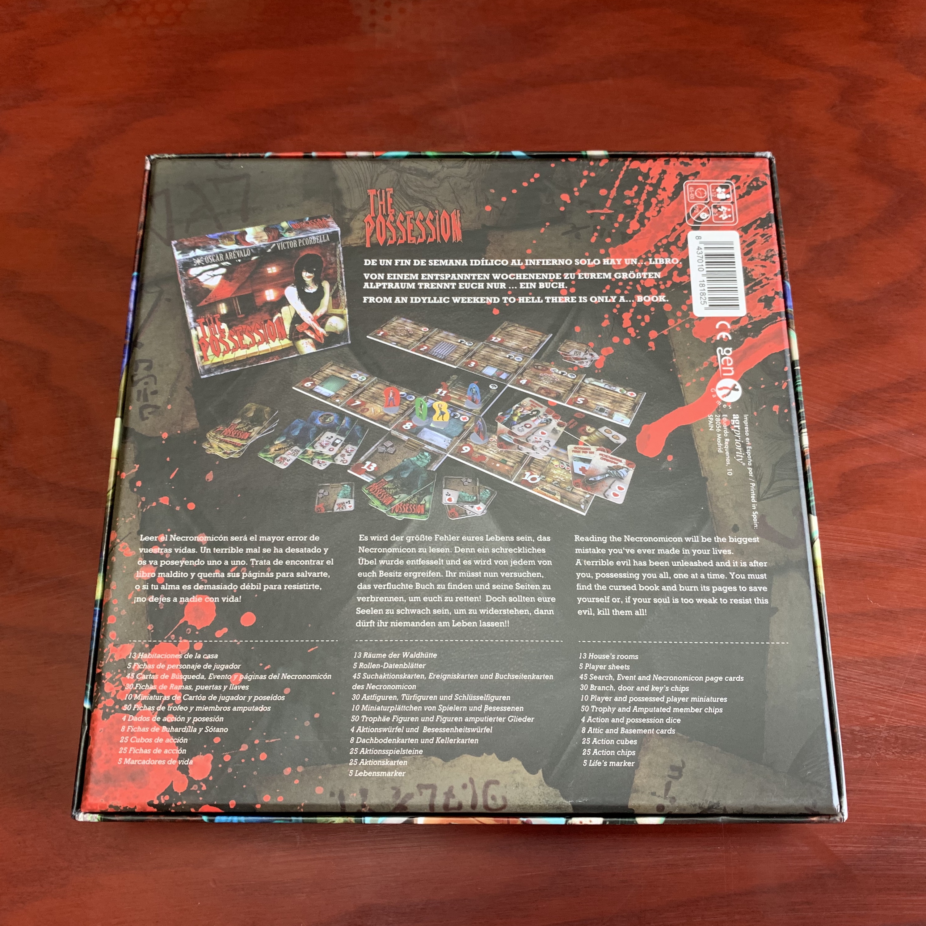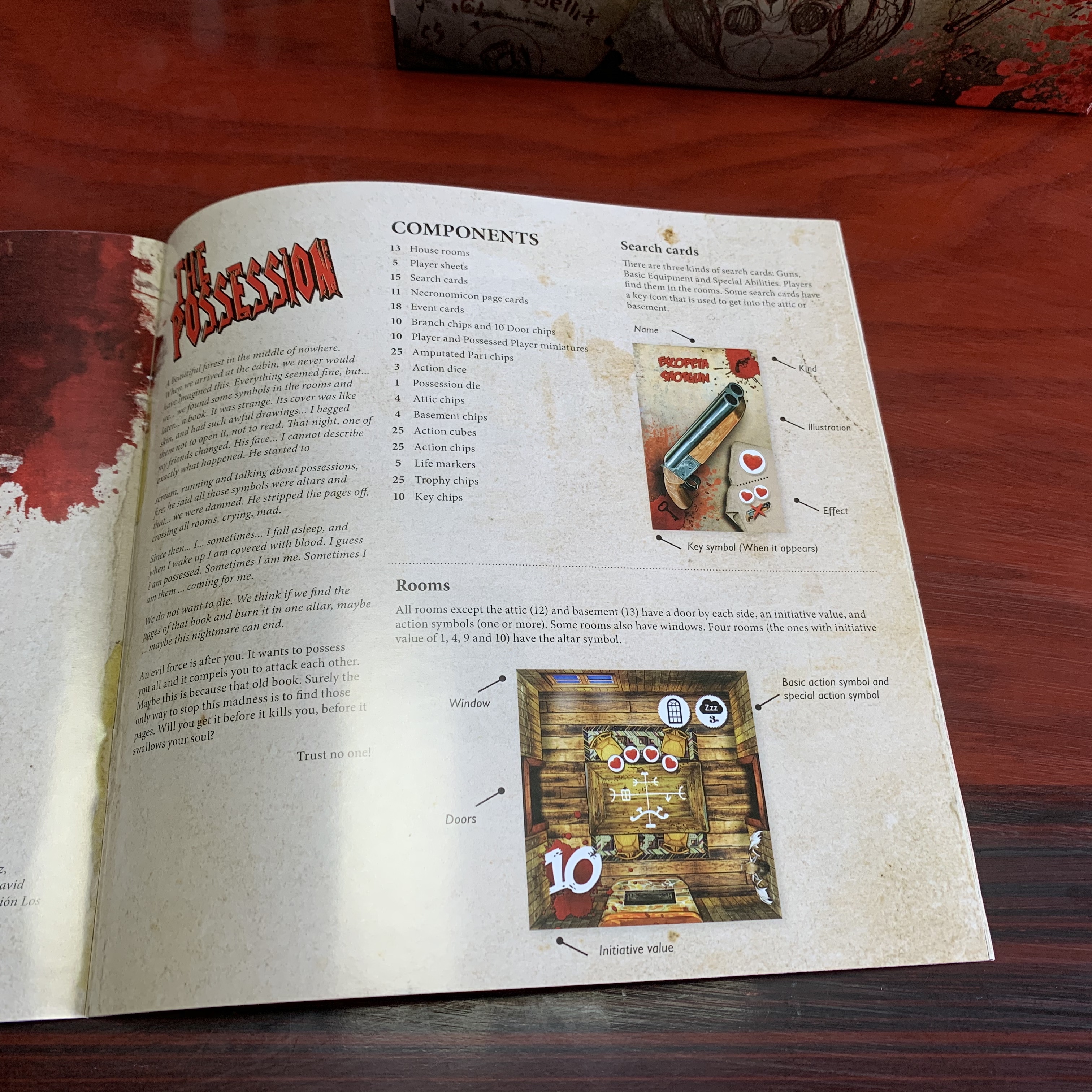 본 박스 이미지다. 표지부터 어떤 게임인지 알려주는 듯 하다.박스 뒷면이다. 게임의 전체적인 모습을 보여준다.윗 박스를 열면 이미 펀칭을 다 마쳤기 때문에 룰북을 제일 위에 올려놓았다.룰북은 다국어 버전으로 되어 있다. 영어로 된 룰이 제일 뒷쪽에 배치되어 있다. 원본 룰북에는 이런 저런 오류들이 있어서 다소 룰을 이해하기 힘들지만, 보드게임긱에 가면 일부 수정된 설명을 Q&A에서 확인할 수 있다.룰북은 13페이지로 구성되어 있어서 양이 많지는 않다. 허나 난 직독직해가 안되므로 짬짬이 번역하면서 다 이해하는데 1주일이 걸렸다. ㅡ,.ㅡ;;;룰북을 걷어 내면 구성물들을 지퍼백에 정리해 놨었다. 위에 보이는 백지 상태의 토큰은 커스텀으로 만들거나 가지고 있던걸 잊어 버렸을 때 사용하라고 넣어 준것 같다.녹색 캐릭터. 왼쪽에 있는 미니어처가 정상적인 상태의 미니어처이고 오른쪽에 있는 미니어처가 홀린 상태의 미니어처이다. 위의 구성물에 액션 칩 4개를 더 추가 해야 되는데 깜빡하고 사진을 찍어 버렸네. 액션 주사위와 홀림 주사위이다. 홀림 주사위는 위에 보이는 자주색이 아니라 검은색이라야 하는데 왜 저색깔로 했는지 모르겠지만, 여튼 저걸 검은 색으로 이해하고 플레이를 하면 된다.왼쪽이 다락방 칩이고 오른쪽이 지하실 칩이다. 해당 장소에 가게 되면 랜덤으로 한 개를 받게 된다.이것은 액션 칩이다. 라운드가 시작될 때 각 플레이어는 자기 색상의 액션칩 중에 하나를 골라서 해당 숫자 만큼 액션을 가지게 된다.왼쪽 부터 문 토큰, 열쇠 토큰, 체력 마커, 트로피 토큰, 악령가지 토큰이다.전체 방 타일을 모아서 산진을 찍어 봤다. 영화에 나오는 집 구조랑 비슷한 면모들을 보여준다.이 타일은 지하실 타일이다.계단 타일이다. 여기에서 첫 라운드를 시작하게 된다.다락방 타일이다. 영화에는 다락방이 나오진 않지만, 게임에서는 플레이어에게 이점을 주기 위해 만들어 넣은 것 같다.영화에도 악령의 책 내용중에 위와 같은 그림들이 나온다. 이 카드는 네크로노미콘 페이지 카드로서 저 일정 카드를 모아서 불태우면 게임에서 승리하게 된다. 참고로 영화에서는 책이 불에 타지 않는다.검색 카드이다. 게임 중에 얻게 되는 아이템으로 전투 혹은 체력을 채우기 위해 쓰이기도 한다.이벤트 카드이다. 라운드 시작 때 어떤 조건에 의해 플레이하게 되는데, 그 조건에 맞는 사람들만 이벤트 내용을 적용하게 된다.이렇게 캐릭터별로 필요한 것들을 한 지퍼에 모아 두어야 게임 셋팅 시 빨리 준비할 수 있을 것 같다.