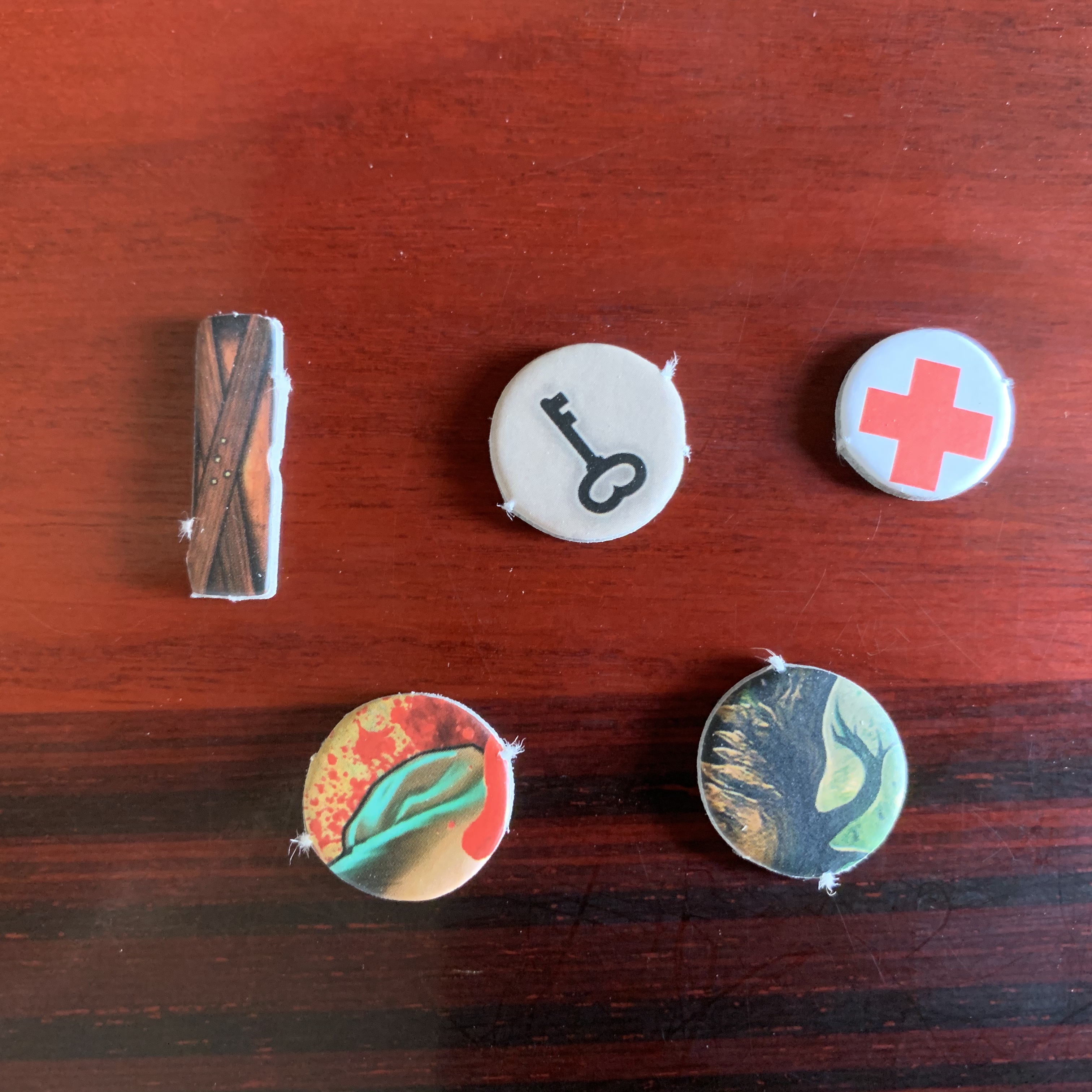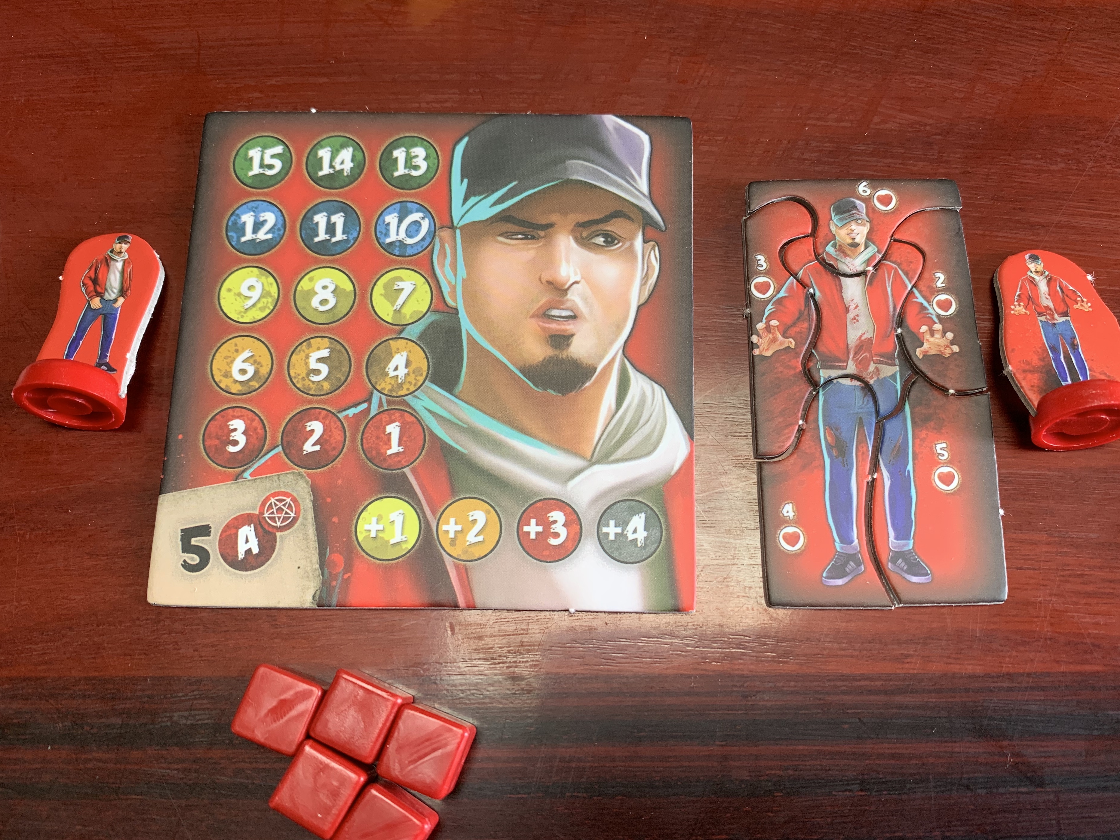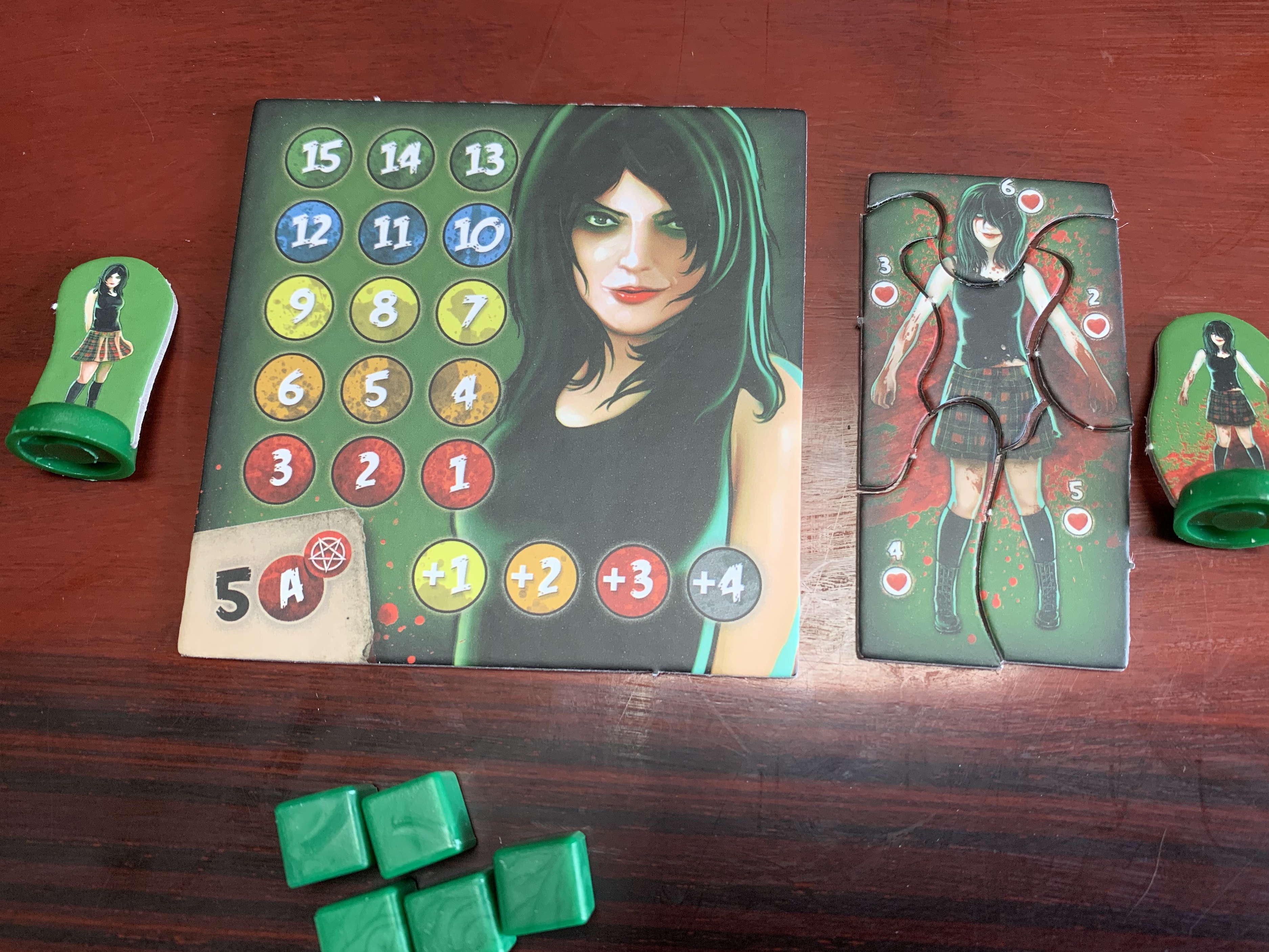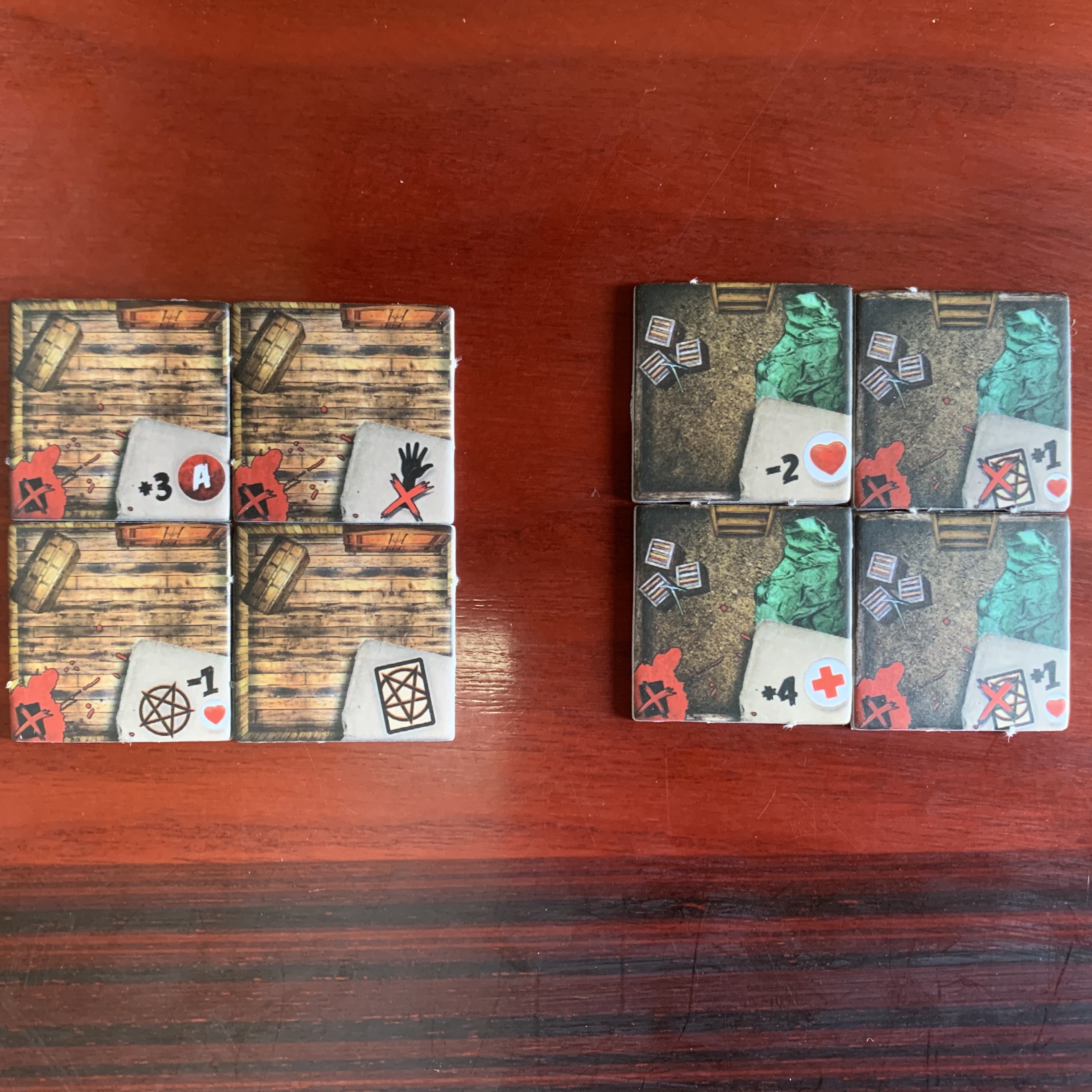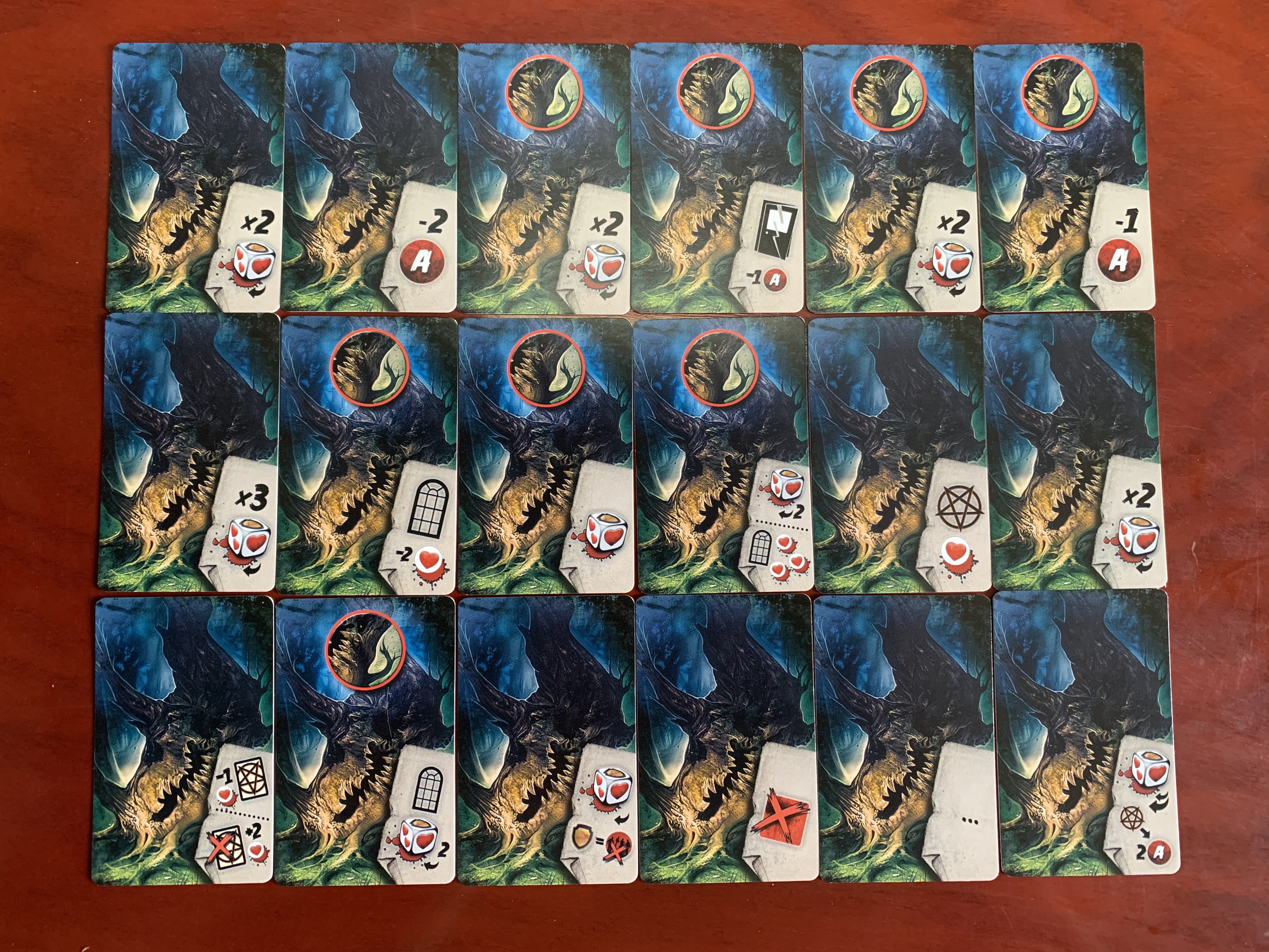 본 박스 이미지다. 표지부터 어떤 게임인지 알려주는 듯 하다.박스 뒷면이다. 게임의 전체적인 모습을 보여준다.윗 박스를 열면 이미 펀칭을 다 마쳤기 때문에 룰북을 제일 위에 올려놓았다.룰북은 다국어 버전으로 되어 있다. 영어로 된 룰이 제일 뒷쪽에 배치되어 있다. 원본 룰북에는 이런 저런 오류들이 있어서 다소 룰을 이해하기 힘들지만, 보드게임긱에 가면 일부 수정된 설명을 Q&A에서 확인할 수 있다.룰북은 13페이지로 구성되어 있어서 양이 많지는 않다. 허나 난 직독직해가 안되므로 짬짬이 번역하면서 다 이해하는데 1주일이 걸렸다. ㅡ,.ㅡ;;;룰북을 걷어 내면 구성물들을 지퍼백에 정리해 놨었다. 위에 보이는 백지 상태의 토큰은 커스텀으로 만들거나 가지고 있던걸 잊어 버렸을 때 사용하라고 넣어 준것 같다.녹색 캐릭터. 왼쪽에 있는 미니어처가 정상적인 상태의 미니어처이고 오른쪽에 있는 미니어처가 홀린 상태의 미니어처이다. 위의 구성물에 액션 칩 4개를 더 추가 해야 되는데 깜빡하고 사진을 찍어 버렸네. 액션 주사위와 홀림 주사위이다. 홀림 주사위는 위에 보이는 자주색이 아니라 검은색이라야 하는데 왜 저색깔로 했는지 모르겠지만, 여튼 저걸 검은 색으로 이해하고 플레이를 하면 된다.왼쪽이 다락방 칩이고 오른쪽이 지하실 칩이다. 해당 장소에 가게 되면 랜덤으로 한 개를 받게 된다.이것은 액션 칩이다. 라운드가 시작될 때 각 플레이어는 자기 색상의 액션칩 중에 하나를 골라서 해당 숫자 만큼 액션을 가지게 된다.왼쪽 부터 문 토큰, 열쇠 토큰, 체력 마커, 트로피 토큰, 악령가지 토큰이다.전체 방 타일을 모아서 산진을 찍어 봤다. 영화에 나오는 집 구조랑 비슷한 면모들을 보여준다.이 타일은 지하실 타일이다.계단 타일이다. 여기에서 첫 라운드를 시작하게 된다.다락방 타일이다. 영화에는 다락방이 나오진 않지만, 게임에서는 플레이어에게 이점을 주기 위해 만들어 넣은 것 같다.영화에도 악령의 책 내용중에 위와 같은 그림들이 나온다. 이 카드는 네크로노미콘 페이지 카드로서 저 일정 카드를 모아서 불태우면 게임에서 승리하게 된다. 참고로 영화에서는 책이 불에 타지 않는다.검색 카드이다. 게임 중에 얻게 되는 아이템으로 전투 혹은 체력을 채우기 위해 쓰이기도 한다.이벤트 카드이다. 라운드 시작 때 어떤 조건에 의해 플레이하게 되는데, 그 조건에 맞는 사람들만 이벤트 내용을 적용하게 된다.이렇게 캐릭터별로 필요한 것들을 한 지퍼에 모아 두어야 게임 셋팅 시 빨리 준비할 수 있을 것 같다.