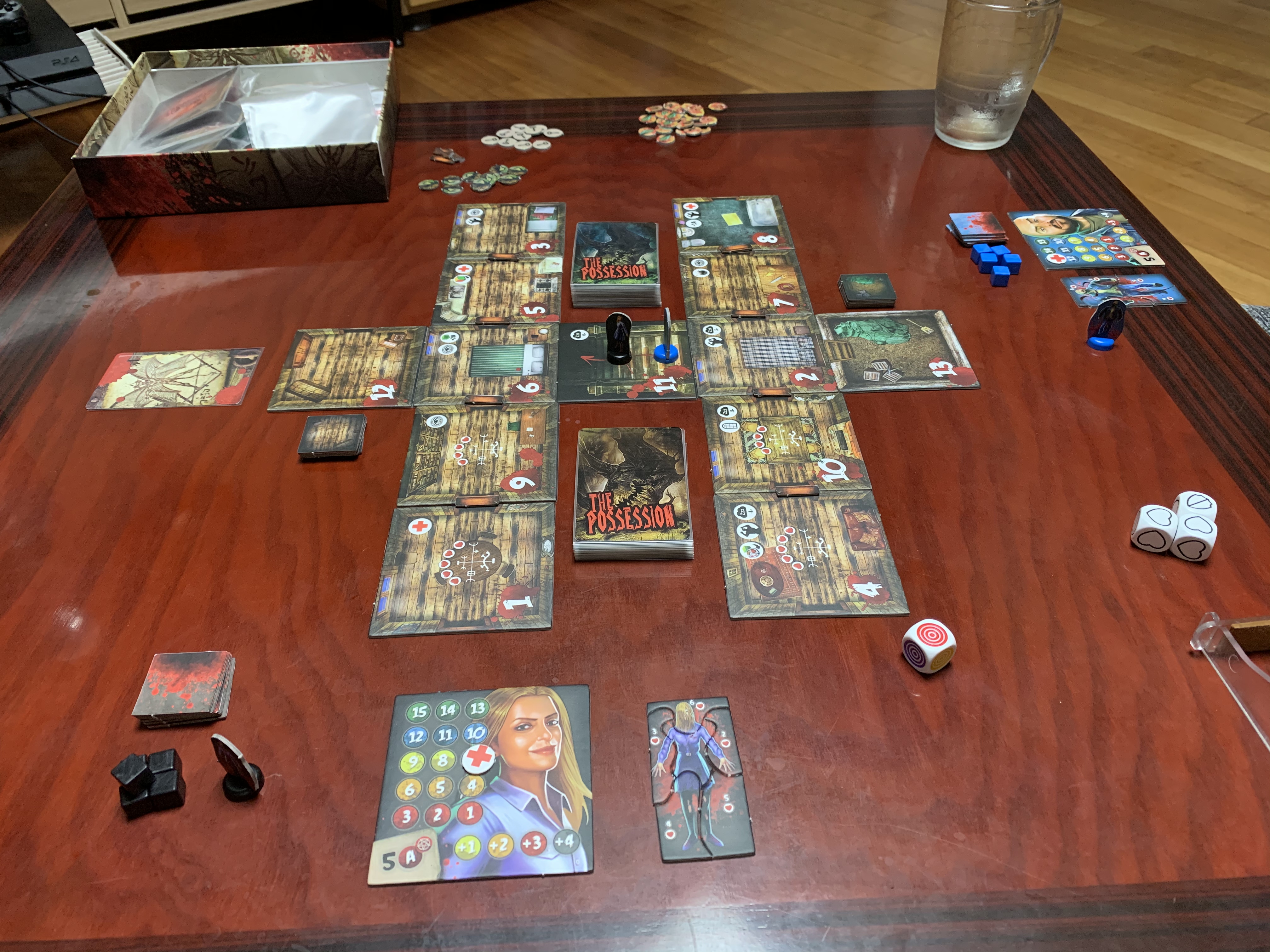 아주 기본적인 것들에 대해 에러플을 하는 바람에 게임은 싱겁게 끝나긴 했지만, 위에 언급한 것들만 잘 지키면 게임은 아주 깔끔하게 진행된다는 점이다. 이블데드 OST를 틀어 놓고 플레이하니 아주 분위기도 잡히고 에러플이 있었지만, 재미있게 플레이를 했다. 라운드 시작시 누가 악령의 지배를 받는지 정하게 되는데, 이 때를 위해 전 라운드에서 어디서 멈추어 있을 지, 문을 닫을 것인지 아닌지를 잘 판단해야 한다. 자칫 동료와 같은 칸에 있다가, 다음 라운드에서 동료가 악령에 홀리게 되면 공격을 받기 때문이다. 맵에 있는 특수 아이콘을 활성화 할 수가 있는데, 잡다한 기능들 없이 플레이에 꼭 필요한 특수 기능만 모아 놓은 느낌이라, 선택지는 늘 분명해진다. 다만, 악령으로 언제 바뀔지 모를 동료들의 도착지를 잘 고려하여 이동을 해야 한다.