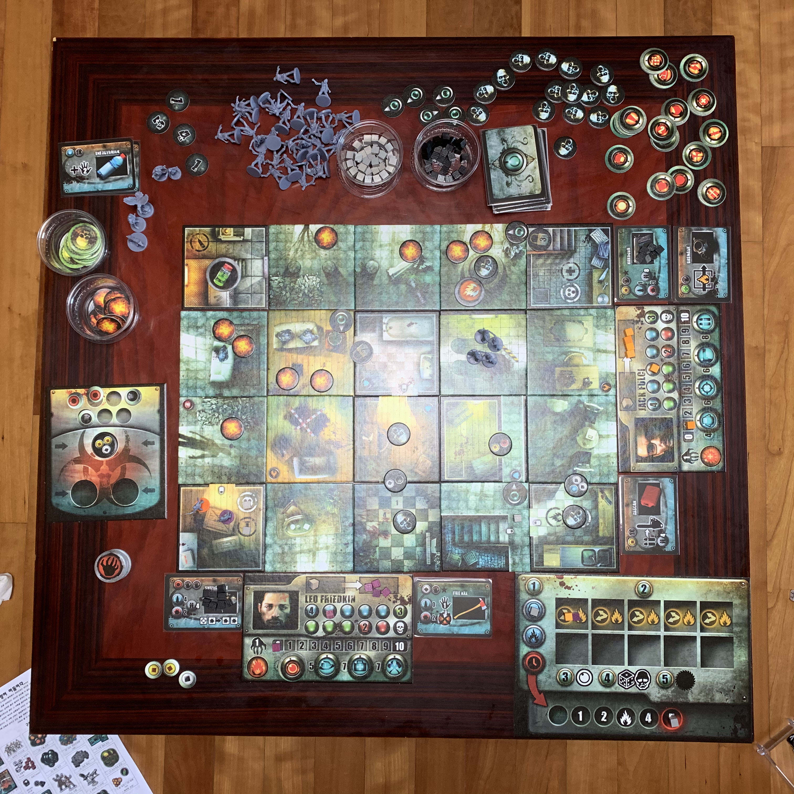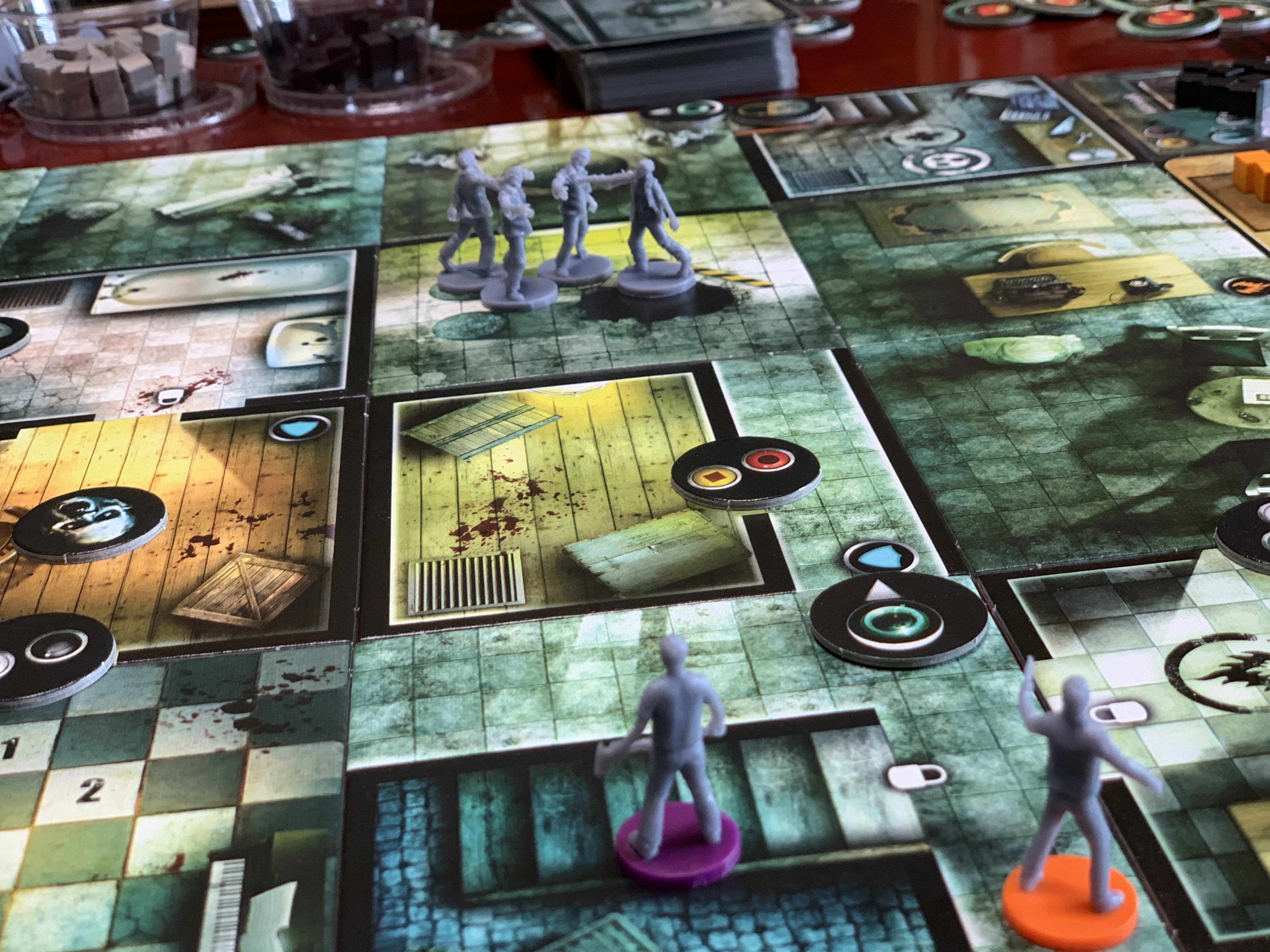 이벤트에도 좀비 증식이 있어서 좀비 증식 토큰이 맵에 놓게 되고, 4번 증비 증식에도 좀비 증식 토큰을 놓게 된다. 이게 생각보다 아니 상상만 해도 좀비들이 마구 마구 놓이게 되는 상황이 펼쳐진다. 그 와중에 화재도 확산이 되고, 약화된 캐릭터는 좀비화로 경험치로 구입할 수 있는 또는 구입했던 스킬들을 잃어 버릴 수 있다. 좀비화로 플레이어 캐릭터는 좀비가 되기도 한다. 초반 플레이를 하는데, 처음이라 전략적인 이동을 하기가 힘들었다. 우선 잠긴문 해제를 위해 아이템 수색위주로 플레이를 해나갔다. 아이템에는 소모품 아이템도 있고, 무기와 같은 장비들도 있다. 장비는 소모품이든 문을 해제 하기 위한 아이콘들을 하나 이상 가지고 있기 때문에, 수색 액션은 필요한 코드 칩을 가지기 위해선 필수 액션이 된다. 근데 이게 생각보다 수색으로 아이템을 얻기가 쉽지 않았다. 이유는 캐릭터 2개로 운영을 하다 보니, 같은 방에 2명이 있으면, 주사위를 2개 굴리고, 혼자 있으면 1개만 굴리기 때문에, 주사위 결과가 성공 아이콘을 보는 기회가 그리 많지는 않기 때문이다. 이래서 여러 캐릭터를 가지고 해야 되나보다. 많다고 해서 꼭 좋은건 또 아닌 것이, 테러 주사위와 같이 굴리게 되는데 생존자 주사위를 굴렸을 때 같은 아이콘 2개가 나온다면 테러 주사위 결과에 해당하는 이벤트가 또 발생하기 때문에, 마냥 좋은 것만은 아니다. 2명 정도가 모여서 수색을 하는게 좋지 않을까? 싶기도 하다.