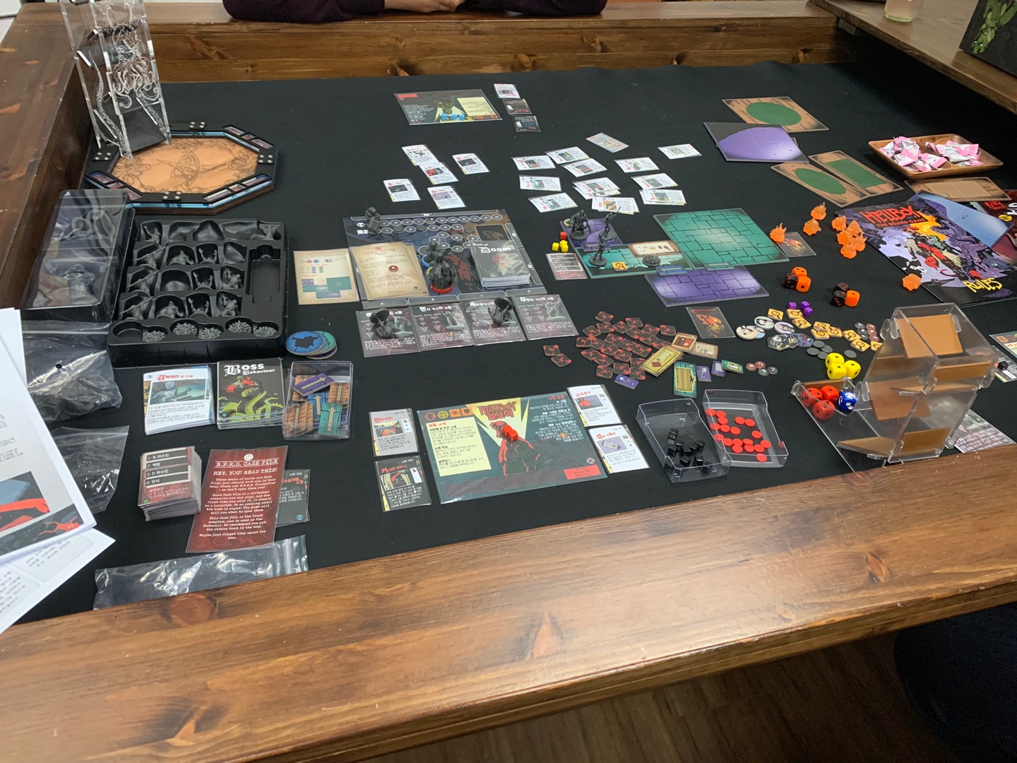 헬보이를 구입한 지 꽤나 됐지만, 틈틈히 받은 자료로 한글화도 하고.. 구성품도 정리좀 하고~~ 미루다 미루다 드디어 게임을 해봤다. 게임의 기본적인 흐름은 기어즈오브워 보드게임과 흡사하다. 세부사항은 다르지만... 좁은 보드에 비해서 여기 저기 구성물들을 펼쳐놔서 그런지(보드게임 테이블이 크니까~~~) 사진에서 보면 엄청 정신없어 보이지만, 실제 간결하게 펼쳐놓고 플레이를 할 수 있다. 캐릭터의 각 기능을 잘 활용하여 한 칸, 한 칸, 전진해 가면서 게임을 조금씩 이해하게 됐다. 시스템상 이것저것 잘 체크하면서 진행해야 하는데, 첫 플레이라~~ 역시 나의 실수로 파멸 마커 진전 하는 것도 잊어 버리고 몬스터만 때려 잡다 보니, 다 잡았는데도 시나리오 카드가 넘어가질 않는 현상이~~ㅡ,.ㅡ;. 그래서 진행한 횟수 만큼 파멸 마커를 전진 시켜서 시나리오를 마무리 하게 되었다.