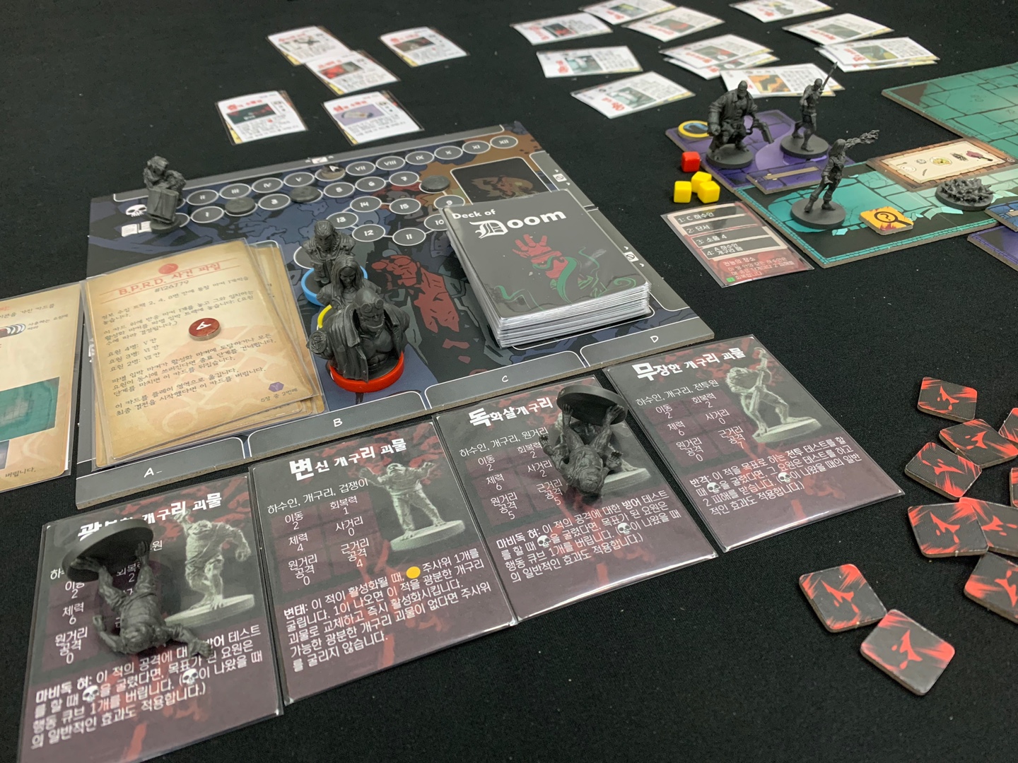 헬보이를 구입한 지 꽤나 됐지만, 틈틈히 받은 자료로 한글화도 하고.. 구성품도 정리좀 하고~~ 미루다 미루다 드디어 게임을 해봤다. 게임의 기본적인 흐름은 기어즈오브워 보드게임과 흡사하다. 세부사항은 다르지만... 좁은 보드에 비해서 여기 저기 구성물들을 펼쳐놔서 그런지(보드게임 테이블이 크니까~~~) 사진에서 보면 엄청 정신없어 보이지만, 실제 간결하게 펼쳐놓고 플레이를 할 수 있다. 캐릭터의 각 기능을 잘 활용하여 한 칸, 한 칸, 전진해 가면서 게임을 조금씩 이해하게 됐다. 시스템상 이것저것 잘 체크하면서 진행해야 하는데, 첫 플레이라~~ 역시 나의 실수로 파멸 마커 진전 하는 것도 잊어 버리고 몬스터만 때려 잡다 보니, 다 잡았는데도 시나리오 카드가 넘어가질 않는 현상이~~ㅡ,.ㅡ;. 그래서 진행한 횟수 만큼 파멸 마커를 전진 시켜서 시나리오를 마무리 하게 되었다.
