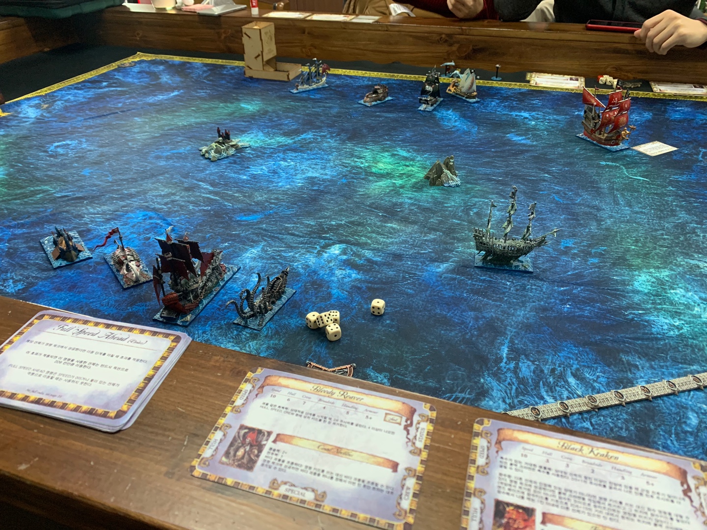 드레드플리트를 가져오신 학현님의 게임도 도색이 되어 있었네? ㅎㅎㅎ 그래서 보드 천과 주사위는 가져오신 학현님 걸로 하고, 배와 카드는 내껄로 플레이를 했다. 함선 한글 번역 카드에 오류가 있다는것도 알게 됐다. ㅡ,.ㅡ;;; 나중에 고쳐야지..