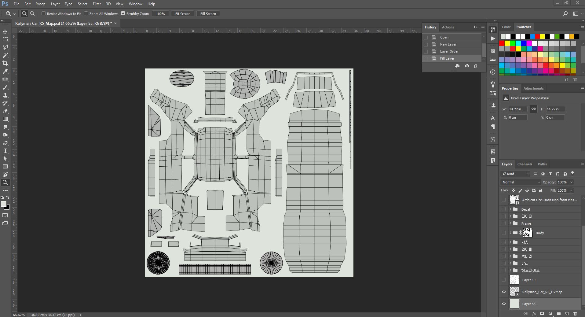 1. 블렌더에서 만들어진 UV 맵을 가져와 필요한 이미지들이 어떻게 배치될지를 볼 수 있도록 레이어로 만들어 그위에 작업을 하게 된다.