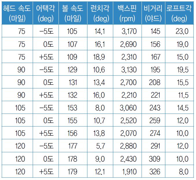 그러면 위의 레이더 실험 자료를 보자. 헤드 속도가 75마일일 때 +5도의 어택 각은 –5도보다 비거리가 22야드 증가하고, 헤드 속도 120마일의 경우에도 볼은 35야드나 더 멀리 날아간다. 또한, 헤드속도가 증가함에 따라 +5도의 어택각일 때 백스핀 값은 더욱 작아짐을 알 수 있다. 이에 따라 지금까지의 이론은 많은 수정과 보완이 이루어져야 할 것이다. 더불어 골프클럽 제조업체들의 고민도 이제 막 시작되었다. 경험을 위주로 한 제조시스템이 과학적인 골프 레이더의 출현으로 한 단계 도약할 수 있을는지? 그러면 어택 각이란 무엇인가? 이 개념이 골프계에 도입된 것은 불과 2∼3년 전으로, 시판되는 골프볼 궤적 프로그램에 이 개념이 포함되면서부터이다. 지금까지의 볼 임팩트와 관련된 모든 설정은 헤드의 밑면이 지면과 평행하게 스윙하는 것을 전제로 계산되었는데 비해, 실제로 비거리를 증가시키려면 헤드 밑면의 앞부분이 지면과 5도 위로 스윙을 해야 한다는 것이다. 물론 이 경우 +5도의 어택 각만이 비거리를 증가시키는 것이 아니고 로프트 각이 작아야 백스핀 값이 작아진다. 많은 논란이 있을 수 있지만 이에 대한 많은 실험 자료를 찾아보아도 클럽 제조업체들의 반증자료는 찾을 수가 없다. 한편, 골프 레이더는 볼이 지면에 떨어질 때의 착지각도 알아낼 수가 있다. 볼이 몇 도로 지면에 떨어질 때 가장 많이 굴러갈까? 물론 착지각이 작을수록 볼이 많이 구르겠지만 그렇게만 생각할 수는 없다. 즉 볼의 비거리는 같더라도 볼의 착지각이 42도보다 작으면 42도보다 클 때에 비해 볼이 구르는 거리는 증가한다. 2006년 12월 「골프다이제스트」에서 드라이버를 로봇에 장착하고 같은 볼을 사용하여 런치각 11.7도, 헤드 속도 105마일로 80회에 걸쳐 실험을 시행하고 나서 그 자료를 분석하였다. 이때 볼의 비거리가 253야드에 볼의 착지각이 42도보다 클 경우는 볼이 18야드 정도 굴러서 드라이브 거리는 271야드인데 비해, 착지각이 42도보다 작은 경우는 드라이브 거리가 288야드로 무려 17야드나 더 굴러 간 것으로 나타났다. 과학자들은 드라이버로 골프 볼을 도대체 얼마나 더 멀리 보낼 것인가. 그 드라이브 거리의 끝은 과연 어디일까.