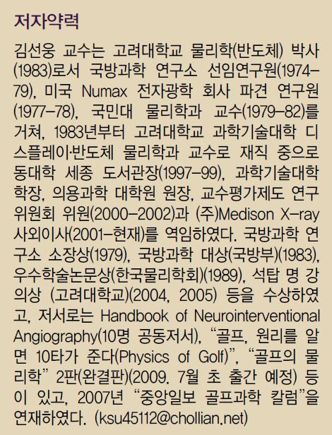 드라이버로 골프 볼을 임팩트한 후 볼이 경쾌한 소리를 내며 하늘 높이 솟구쳐 올라가 초록빛 초원을 가로지르며 까마득하게 멀리 날아가 떨어질 때면 끝없는 연구와 논문 집필로 쌓였던 스트레스도 한 방에 날아간다. 수많은 골퍼가 이 맛에 골프를 한다고 한다. 그러나 비거리가 별로 안 나오면 오히려 스트레스만 더 쌓인다. 어떻게 하면 볼을 더 멀리 보낼 수 있을까? 물론 볼은 인사이드-아웃으로 임팩트해도 아웃사이드-인사이드로 임팩트할 때보다 더 멀리 날아간다. 최근 2∼3년 전부터는 미사일 추적의 레이더의 원리를 이용한 골프 레이더의 출현으로 임팩트 순간에서부터 볼이 지면에 떨어지기까지 약 20개의 정보를 쉽게 얻을 수 있게 되었다. 이 레이더를 이용하여 얻은 자료를 분석하는 중에 과학자들은 유체역학과 관련된 매우 흥미로운 사실을 알게 되었다. 지금까지의 골프볼 임팩트의 모든 설정은 드라이버 헤드의 밑면이 지면과 평행한 스윙을 전제로 하여 계산되었고, 이에 근거하여 클럽 제작 및 피팅을 하고 있다. 지금까지의 이론에 의하면 보통의 아마추어는 헤드의 로프트 각이 12∼14도에 백스핀이 약 3,000 rpm인 경우 비거리가 가장 큰 것으로 알려졌다. 그래서 많은 경우 골프클럽 제조업체들은 실제로는 로프트 각을 12∼14도로 만들면서도 골퍼들의 자존심을 의식하여 광고에는 9∼11도로 실제와는 다르게 선전하고 있다.