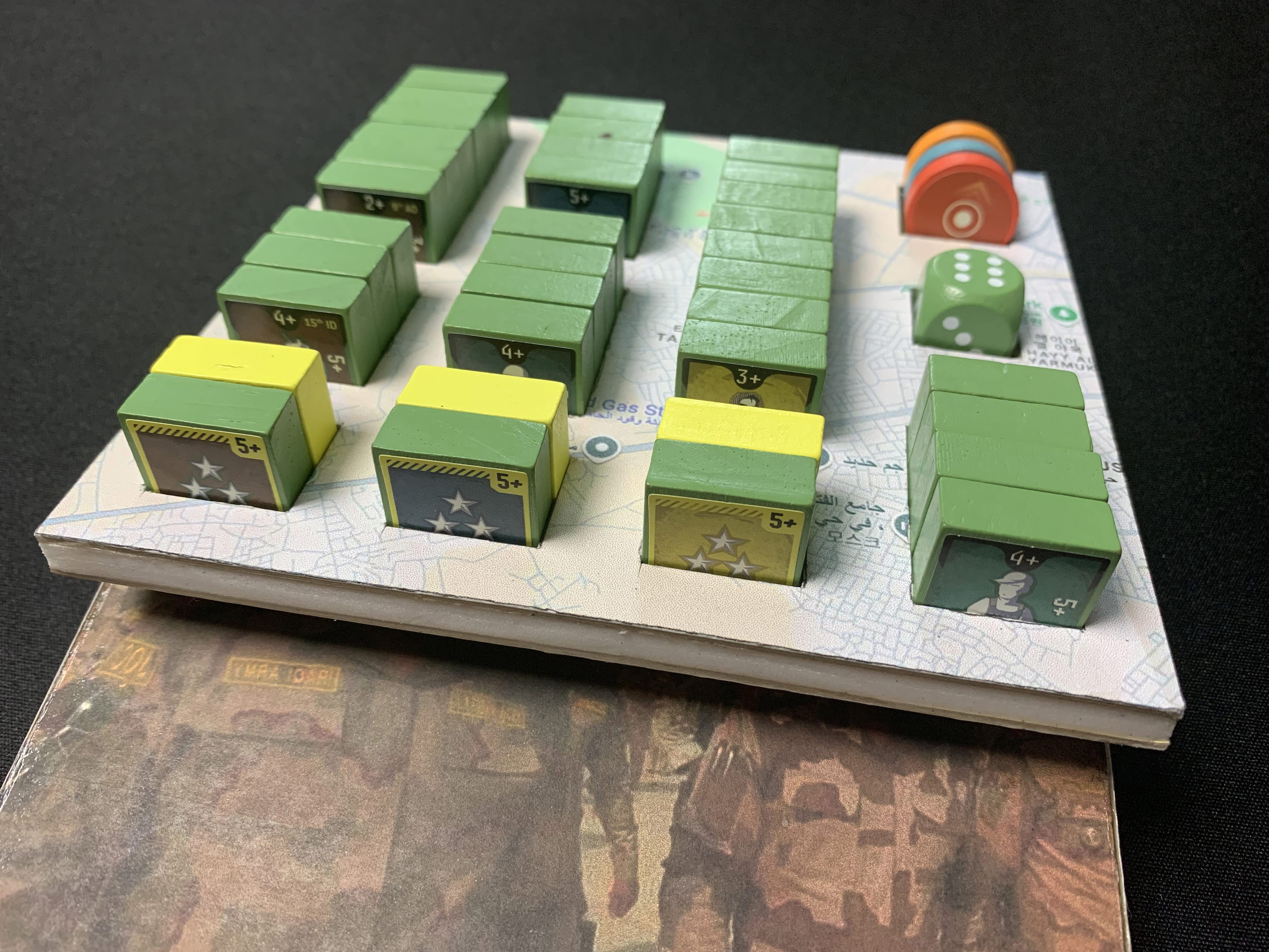 이라크 진영이 다에시 진영 보다 블럭 수가 적다. 그렇다고 마구 막강하지는 않다. 좀 쎄다고 할 만한 유닛이 탱크 정도. 오른쪽 상단에 있는 둥근 나무 토큰은 공용 마커로서 맵보드에 있는 트랙에 배치하는 나무 마커다. 공용 토큰은 다에시 진영 트레이와 적당히 분산해서 넣었다.